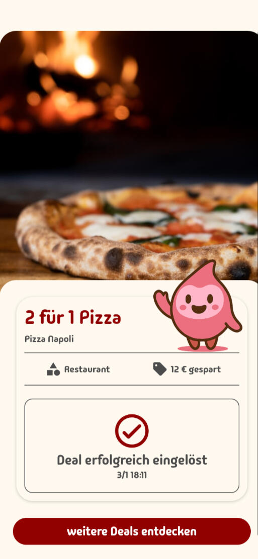 Du hast vollen Zugriff zu allen Deals komplett kostenlos. Es gibt keine versteckten Kosten. Heute 2 für 1 Pizza, Morgen 2 für 1 Kino.